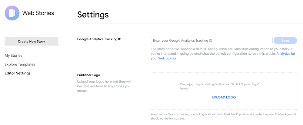With the installation done, you will have a Stories option in the Dashboard. Go to Stories > Editor Settings. Now you can place your Google Analytics Tracking ID and Upload a logo to be available to any stories you create.